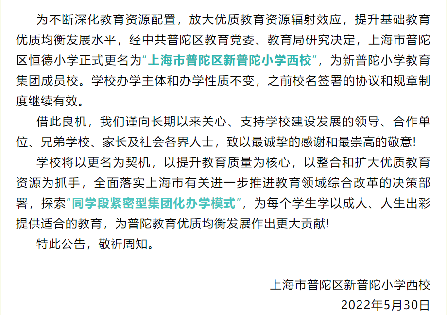 关于上海市普陀区恒德小学更名为上海市普陀区新普陀小学西校的公告